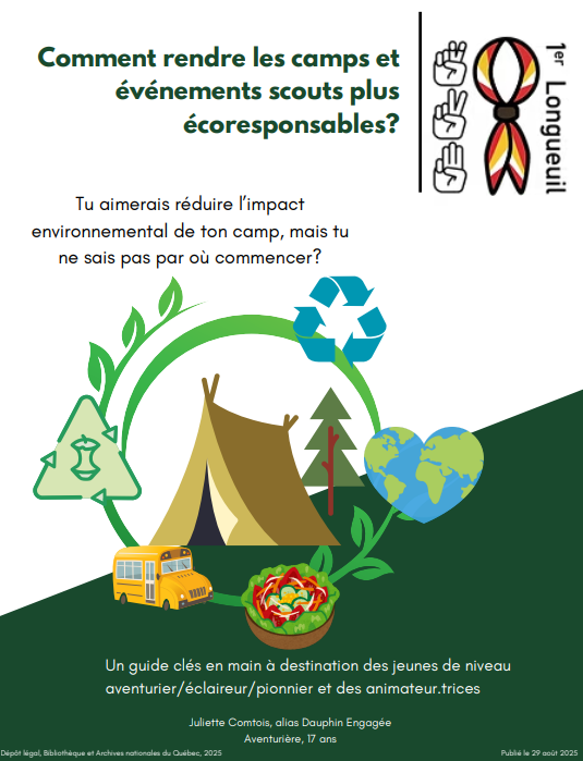Au cours de cette année scoute, j'ai réalisé un projet environnemental d'envergure: j'ai écrit un guide à l'intention des équipes d'animation et des jeunes de la branche Éclaireurs et au-delà vulgarisant les moyens de rendre les camps et activités scouts plus écoresponsables. Il s’agit d’un guide clé en main qui totalise 18 pages sans compter les annexes et la bibliographie, qui fournit des informations et des indications concrètes pour réduire l’impact environnemental des camps, et qui est axé sur trois thèmes principaux: la gestion des matières résiduelles, l’alimentation écoresponsable et le transport. J'ai également écrit une version résumée de 5 pages qui reprend l'essentiel du contenu de mon guide dans un format plus succinct et facile à consulter. Dans le cadre de ce projet, j’ai aussi présenté le contenu de mon guide lors d’une courte formation à toute l’équipe d’animation de mon groupe, le 1er Longueuil, et j’en ai mis en pratique les notions pour réduire l’impact environnemental du camp d’été de ma troupe d’aventuriers. J’ai réellement l’impression d’avoir initié un virage écoresponsable dans les pratiques du 1er groupe scout de Longueuil.