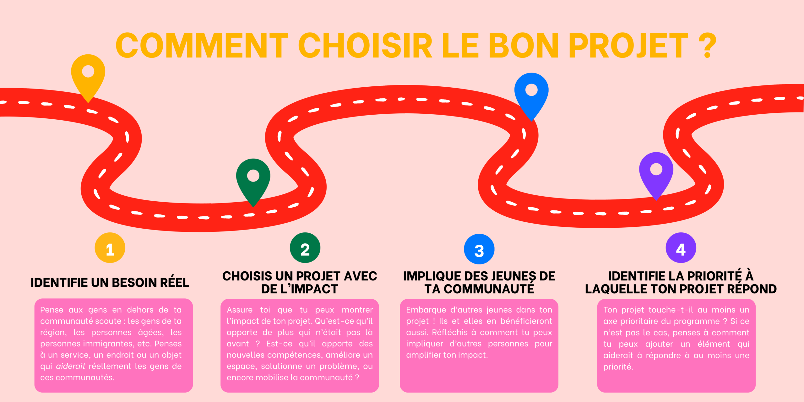 Le programme est basé sur un mécanisme de remboursement de factures. Ça signifie que toi, ou ton groupe ou ton district scout, devez payer ces factures pendant la réalisation du projet. Il est donc important que tu discutes de cela avec ton ou ta responsable. Tu auras d’ailleurs éventuellement à nous fournir un spécimen de chèque de ton groupe ou de ton district et les coordonnées de la personne qui gère ce compte.